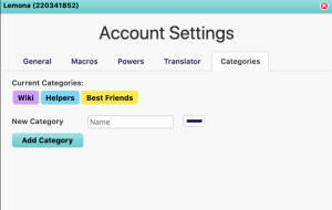 To create a category, click on your own name and press the "Settings" button. From there, you will see the "Categories" button at the very top right. From here, you may enter a customizable name for your category and press the "Add Category" button. The new category will then be shown on your friends list.